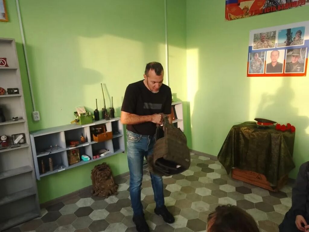 Фетисов А. Н. рассказал о своём боевом опыте, об оружии, о рации, о средствах защиты. Ребята рассматривали планшеты, карты боевых действий, пробовали на время одевать противогаз, разговаривать по рации, примерять бронежилет.