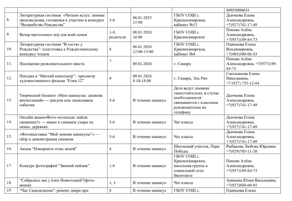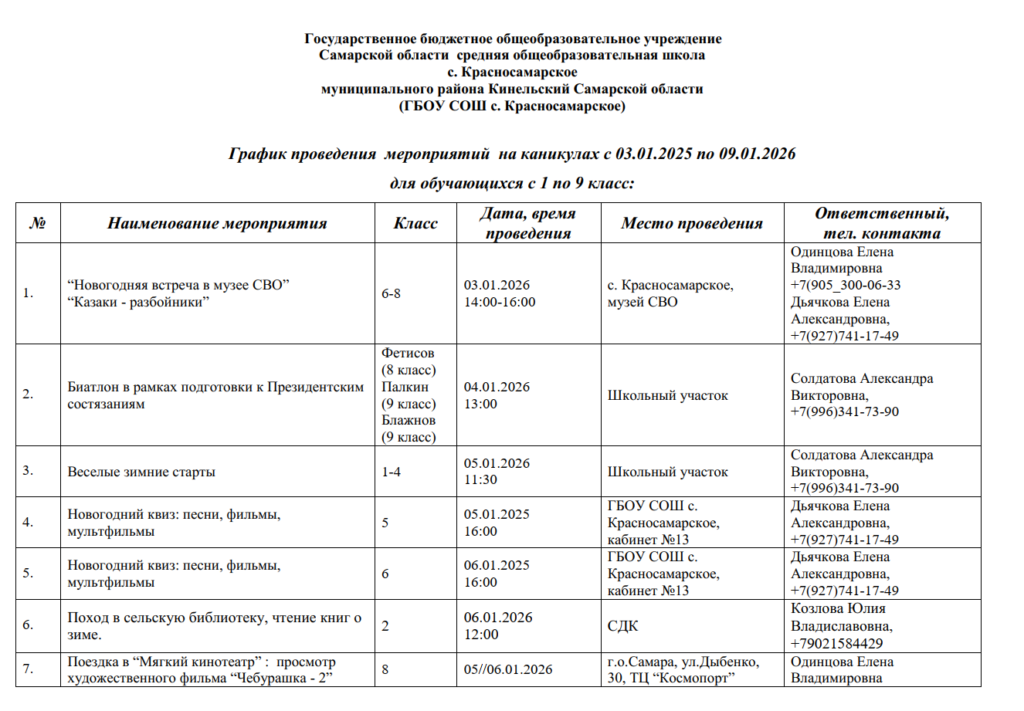 План работы школы на зимних каникулах