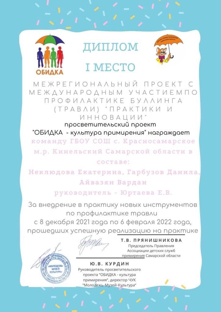 С 8 декабря 2021 года по 6 февраля 2022 года проходил проходил Межрегиональный проект с международным участием по профилактике буллинга «Практики и инновации». Медиаторы ГБОУ СОШ с.Красносамарское приняли в нем участие. В рамках этого проекта было необходимо апробировать новейшие методики, разработанные командами медиаторов других школ по профилактике буллинга, на ребятах нашей школы. В ходе работы было проведено 7 занятий.