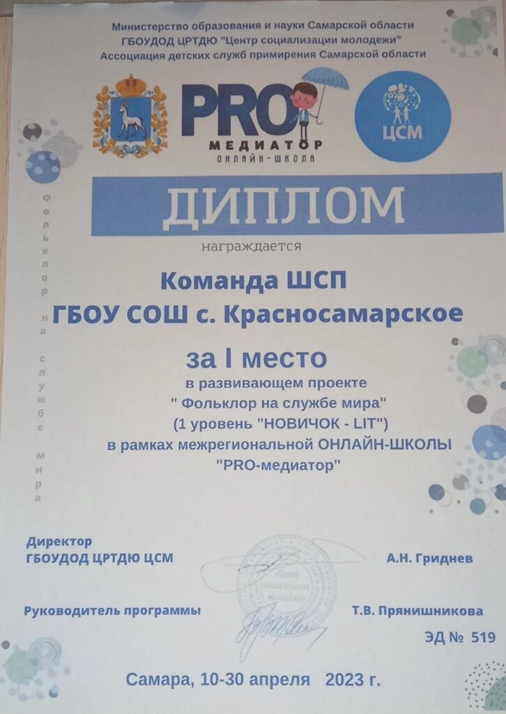 В апреле 2023 года наша команда стала участником развивающего проекта в рамках межрегиональной онлайн-школы «PRO-медиатор» и заняла первое место